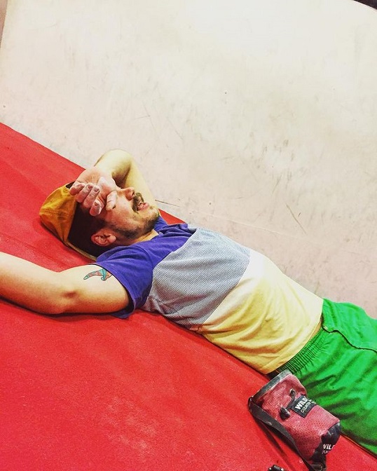 無駄がなくヘルシーで、ボルダリングに対する真摯な姿勢がうかがえる素敵な海外クライマーのコーデ。引き締まった筋肉が格好いいシンプルなスタイルで、幅広い世代のクライマーがお手本にできる服装ではないでしょうか。ボルダリングに大切な腕周りと、目で足の位置を目視できるように7分丈のレギンスを使用する、そんなパフォーマンス重視のスタイルです。